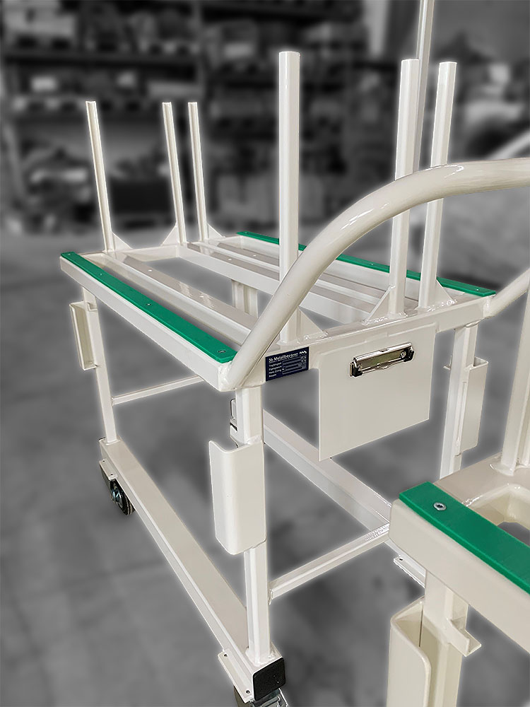 Pulverbeschichtet und versehen mit Kunststoff-Gleitschienen für das Handling der Teile auf dem Wagen.